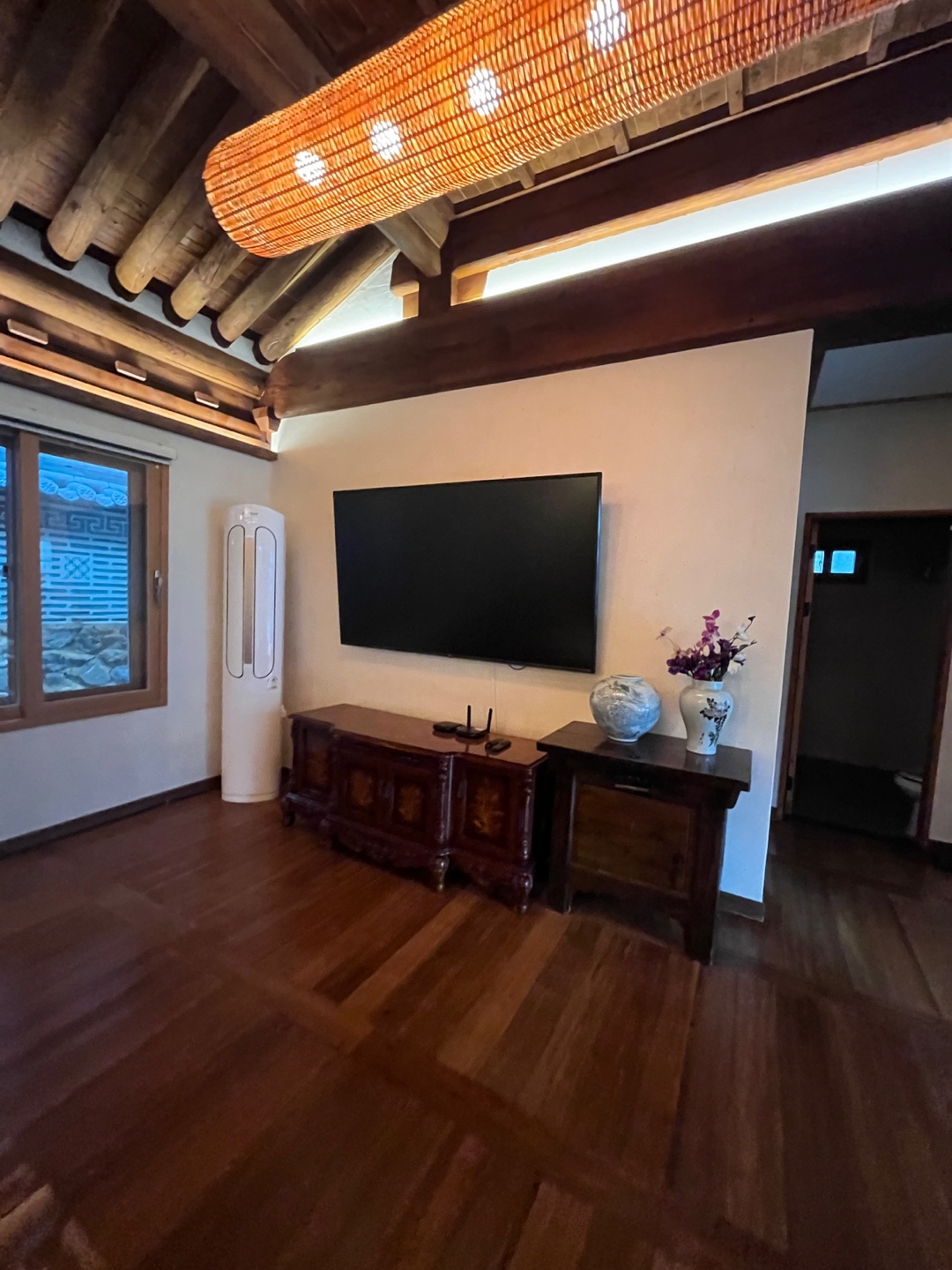 거실이 정말 넓었어요. TV도 75인치 정도 되는 듯 했어요. 소파도 정말 깨끗하고 편했습니다. 저희는 8인이었는데 정말 넓게 사용했습니다. 거실 오른편에는 비품들이 있었는데 추가 수건, 걸레, 윷놀이, 고스톱, 제기, 드라이기 등 정말 불편함 없이 한옥 펜션을 즐길 수 있도록한 세심한 배려가 돋보였습니다.