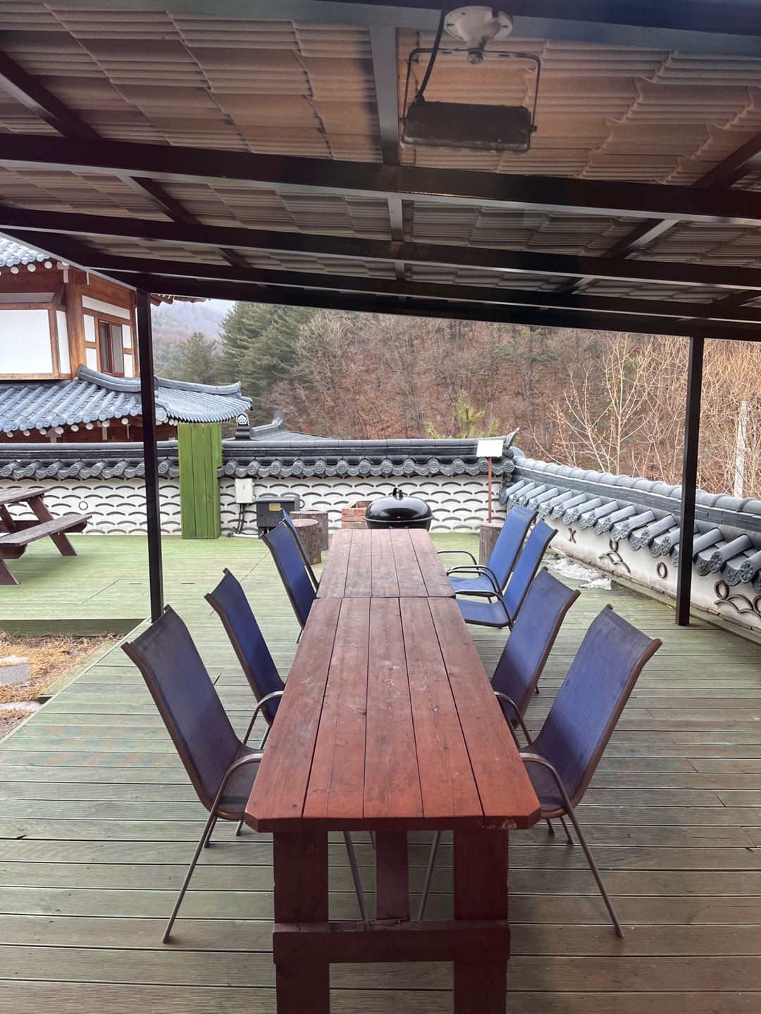 - 한옥 감성: 처마 끝 풍경과 툇마루가 너무 예쁘고 뒤에 산이 보이는데 정말 자연 속의 한옥이 아름다웠습니다.