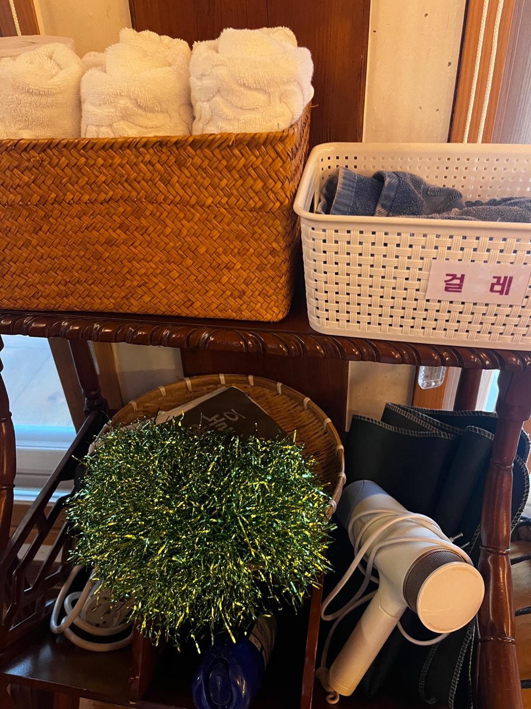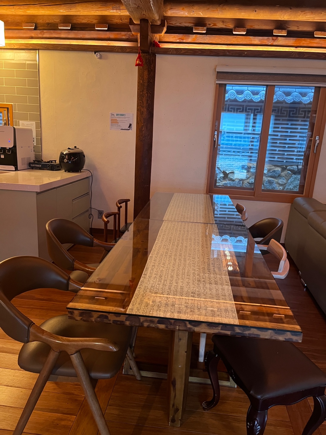 거실이 정말 넓었어요. TV도 75인치 정도 되는 듯 했어요. 소파도 정말 깨끗하고 편했습니다. 저희는 8인이었는데 정말 넓게 사용했습니다. 거실 오른편에는 비품들이 있었는데 추가 수건, 걸레, 윷놀이, 고스톱, 제기, 드라이기 등 정말 불편함 없이 한옥 펜션을 즐길 수 있도록한 세심한 배려가 돋보였습니다.