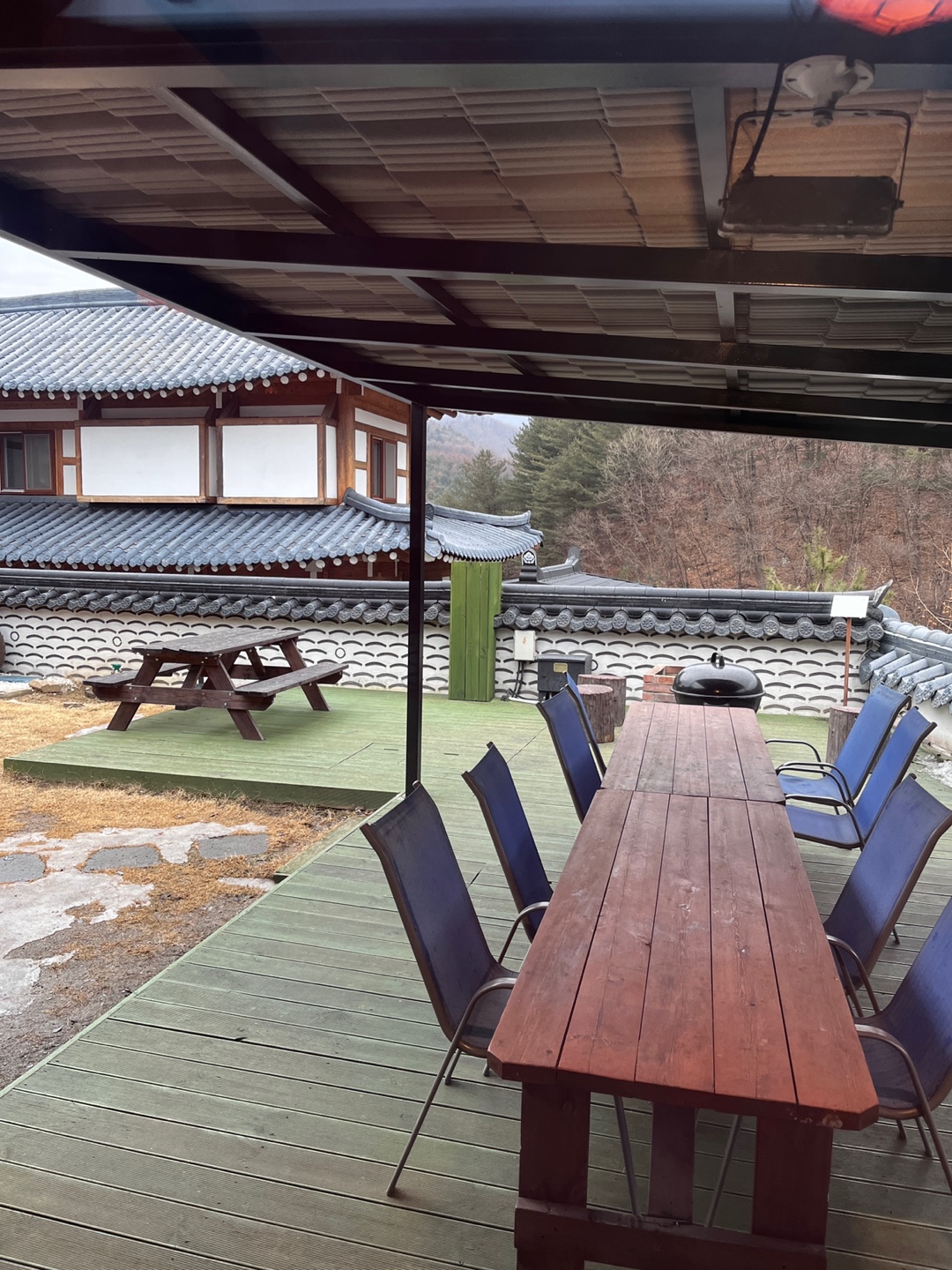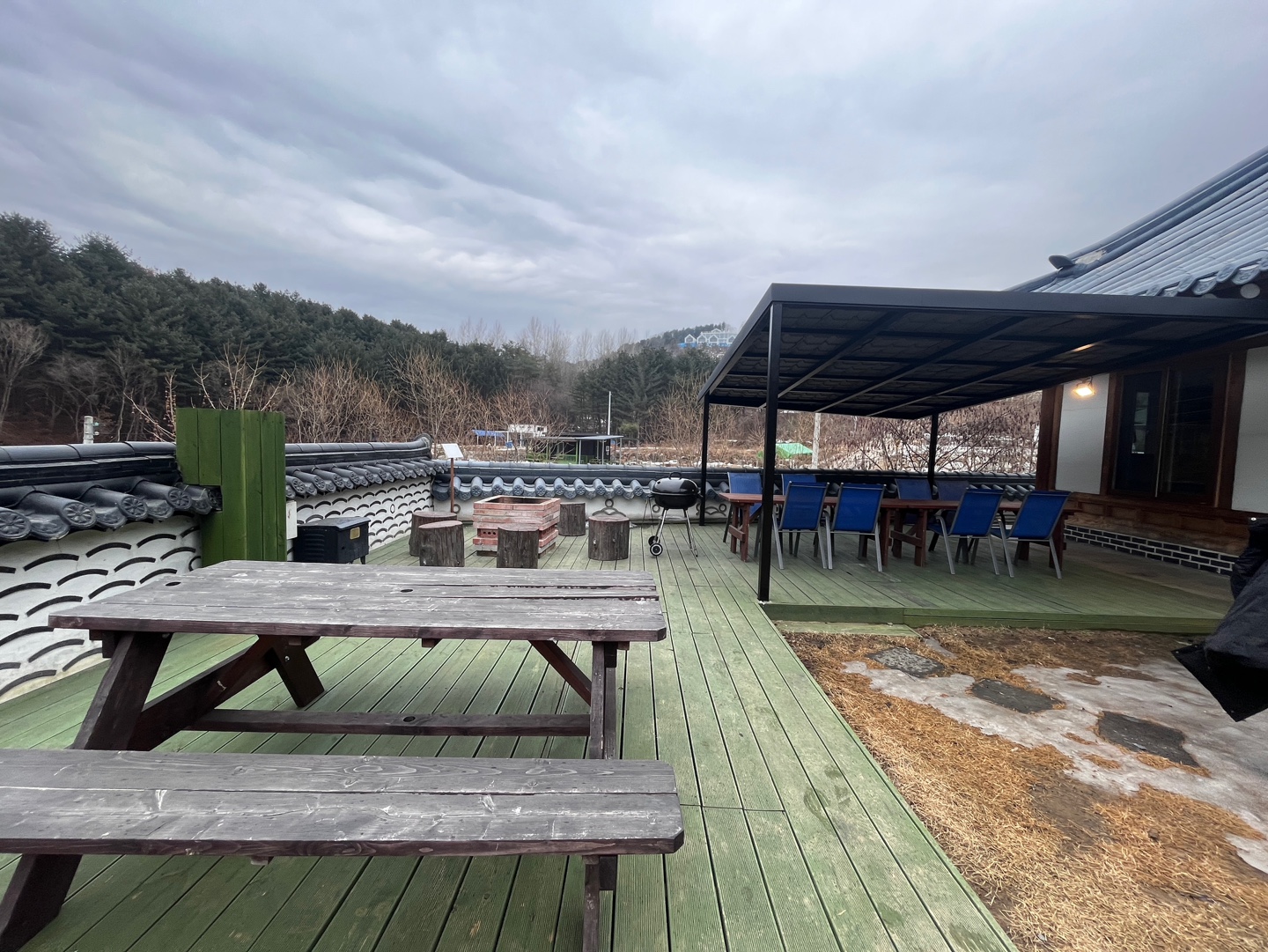 바베큐장과 불멍 장소는 바로 앞에 위치해 있어요. 비가 오거나 눈이 와도 바베큐를 할 수 있도록 위에 지붕이 있었습니다.