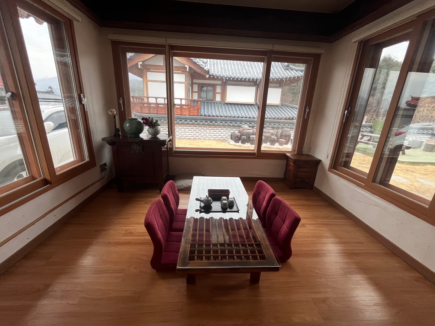- 한옥 감성: 처마 끝 풍경과 툇마루가 너무 예쁘고 뒤에 산이 보이는데 정말 자연 속의 한옥이 아름다웠습니다.