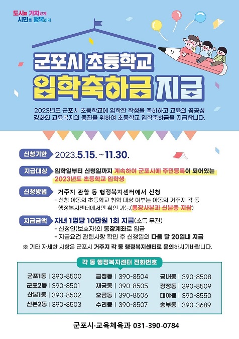 군포시에서 2023년도 초등학교 입학 축하금을 지급합니다.