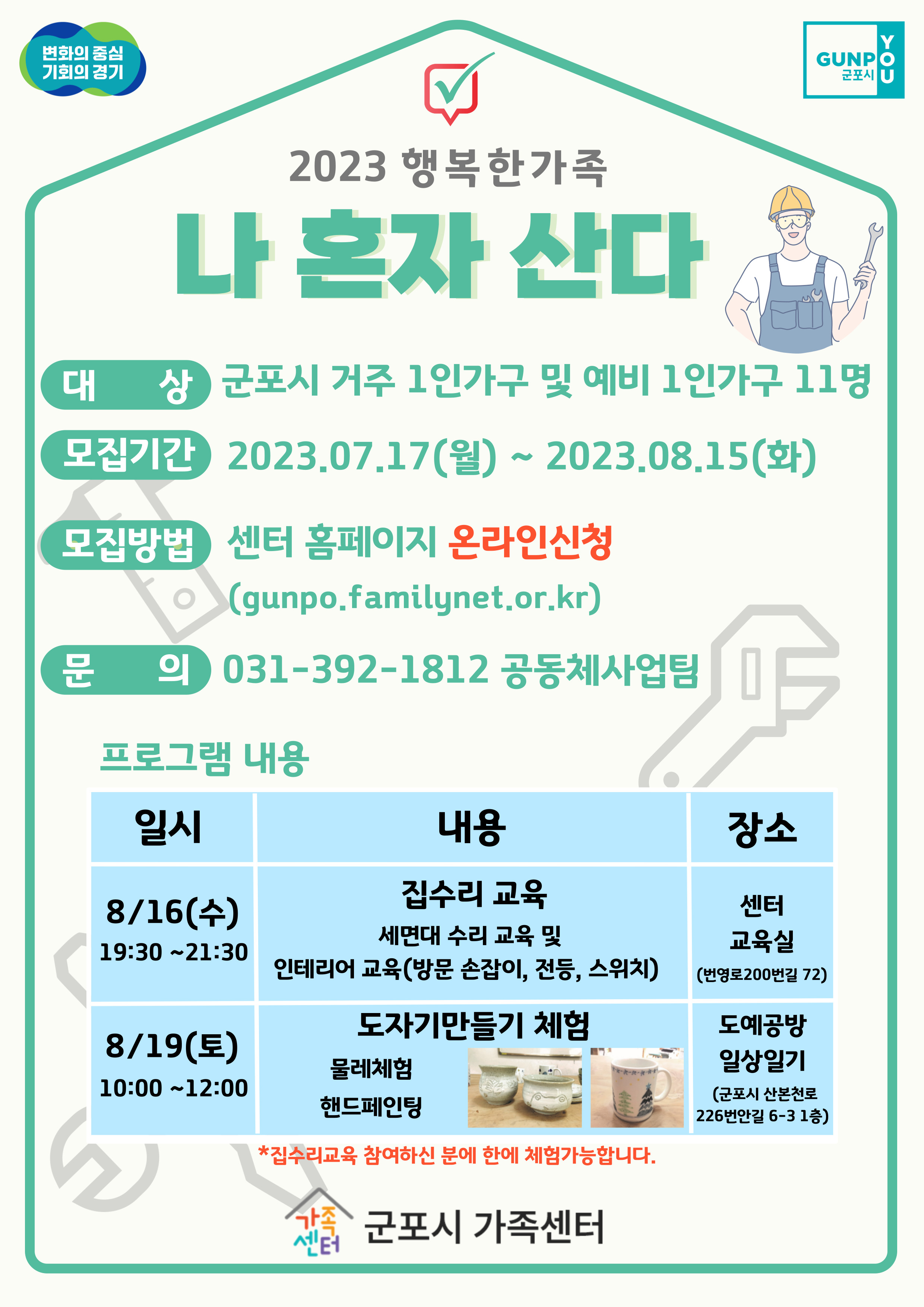군포시 가족센터에서 1인 가구 대상 교육을 실시합니다.