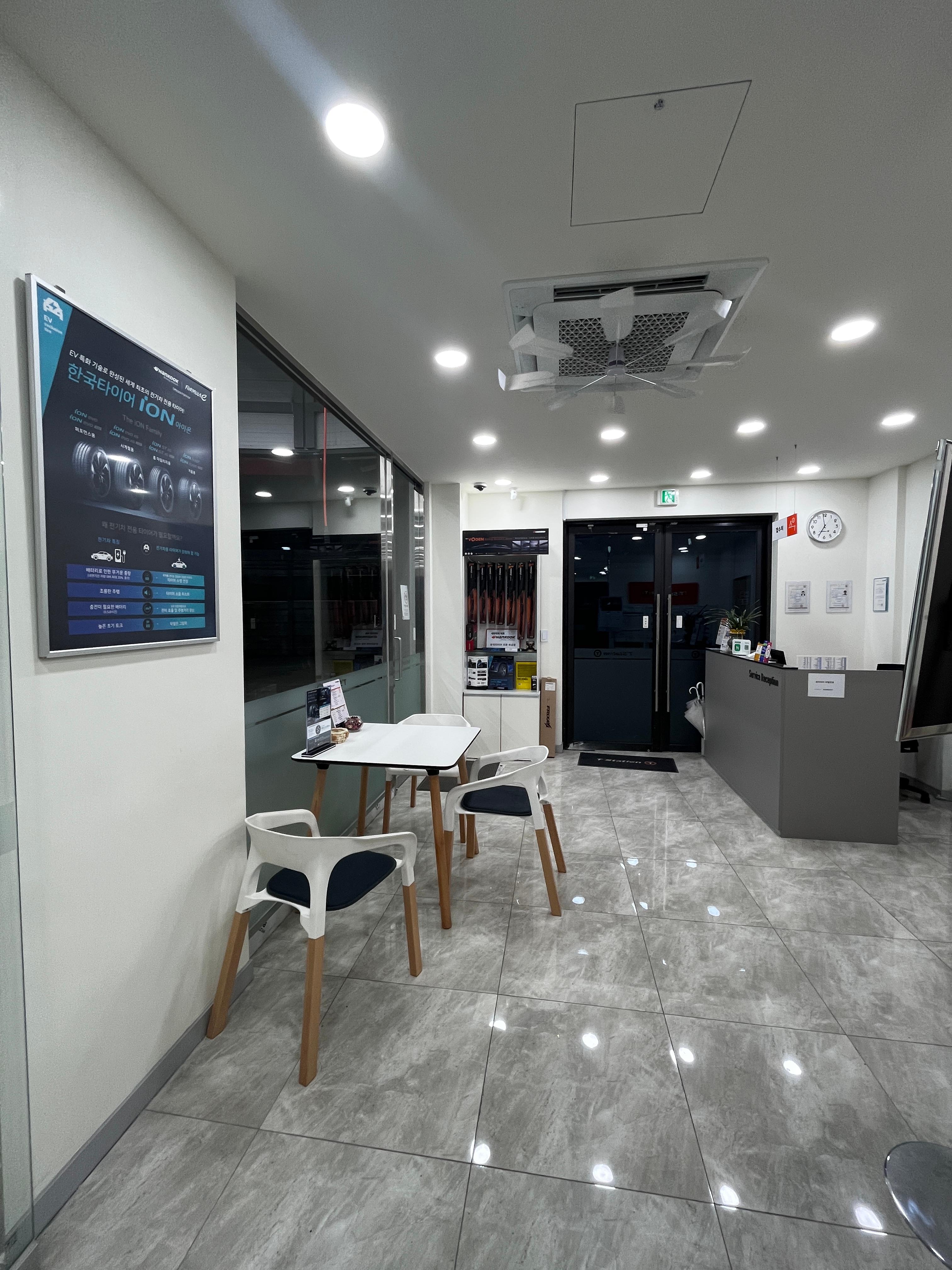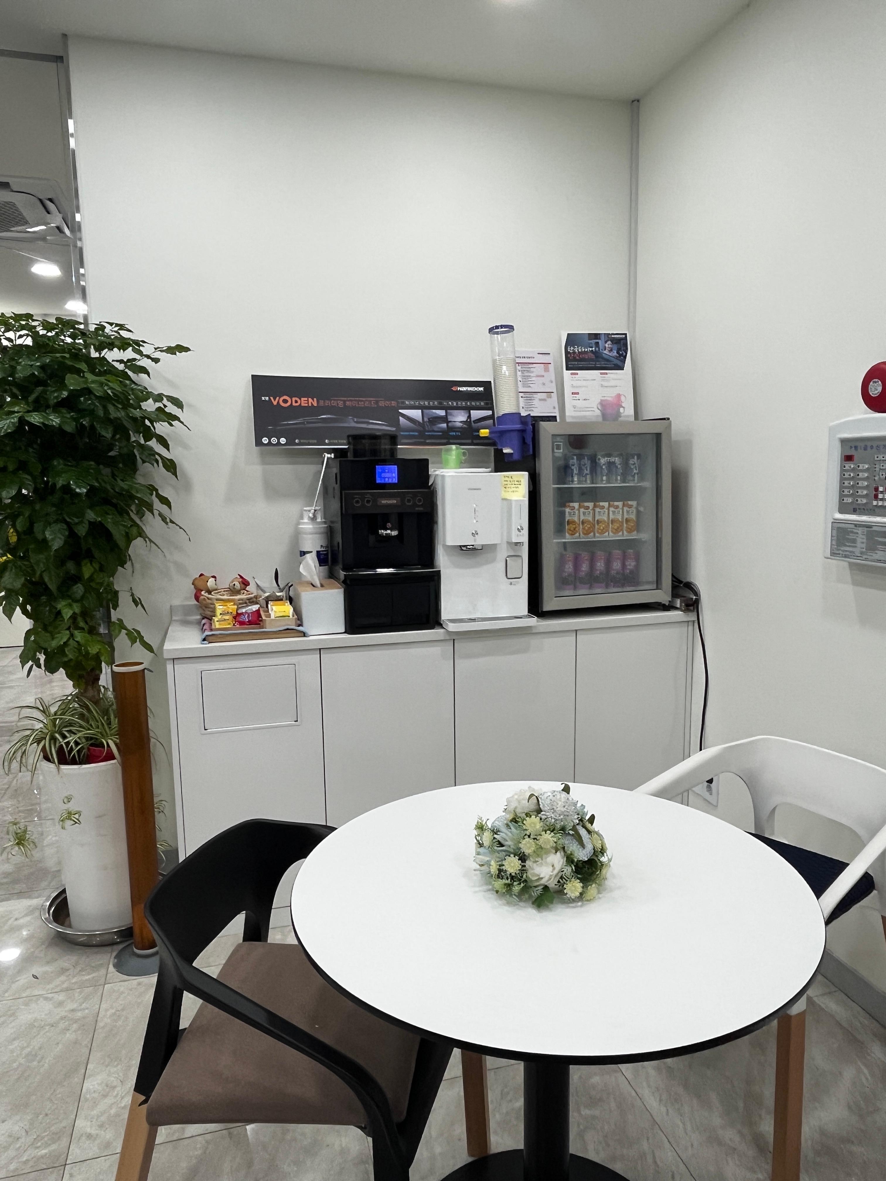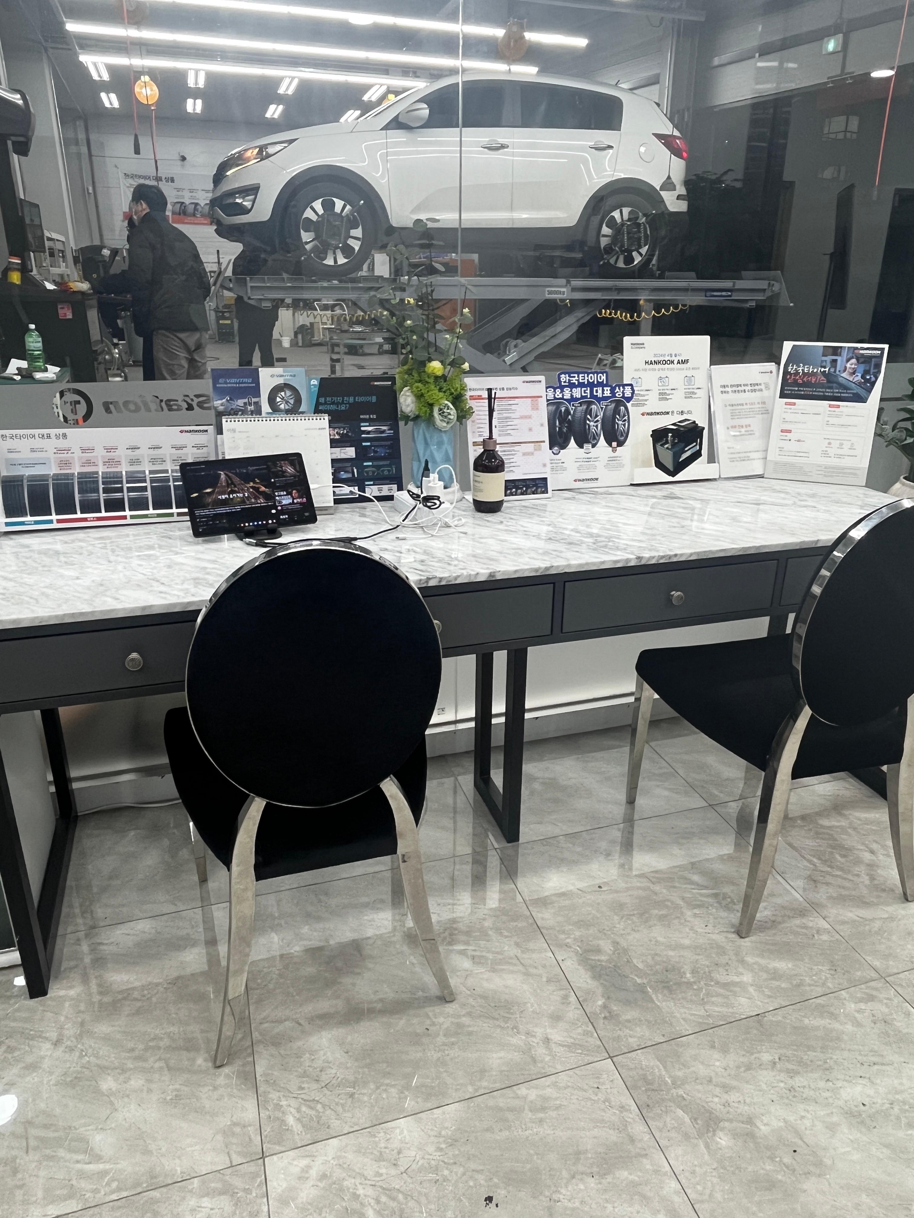 타이어를 교체하는 동안 투명한 유리창을 통해서 교체하는 전 과정을 볼 수 있었고 기다리는 동안 대기공간에서 다과와 차를 이용할 수도 있게 해놨더라구요.