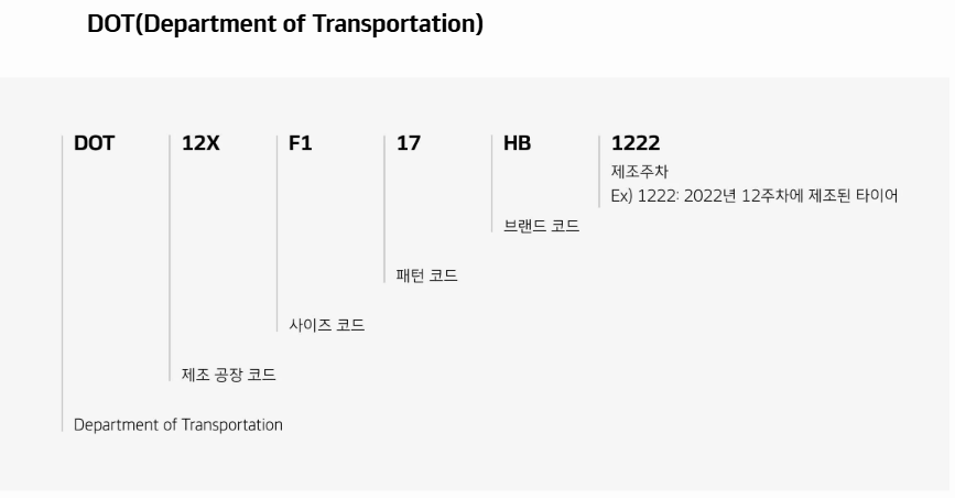 예를들어 한국타이어 DOT가 1222라면 22년도 12주차에 생산된 타이어라는 거라고 하네요.
