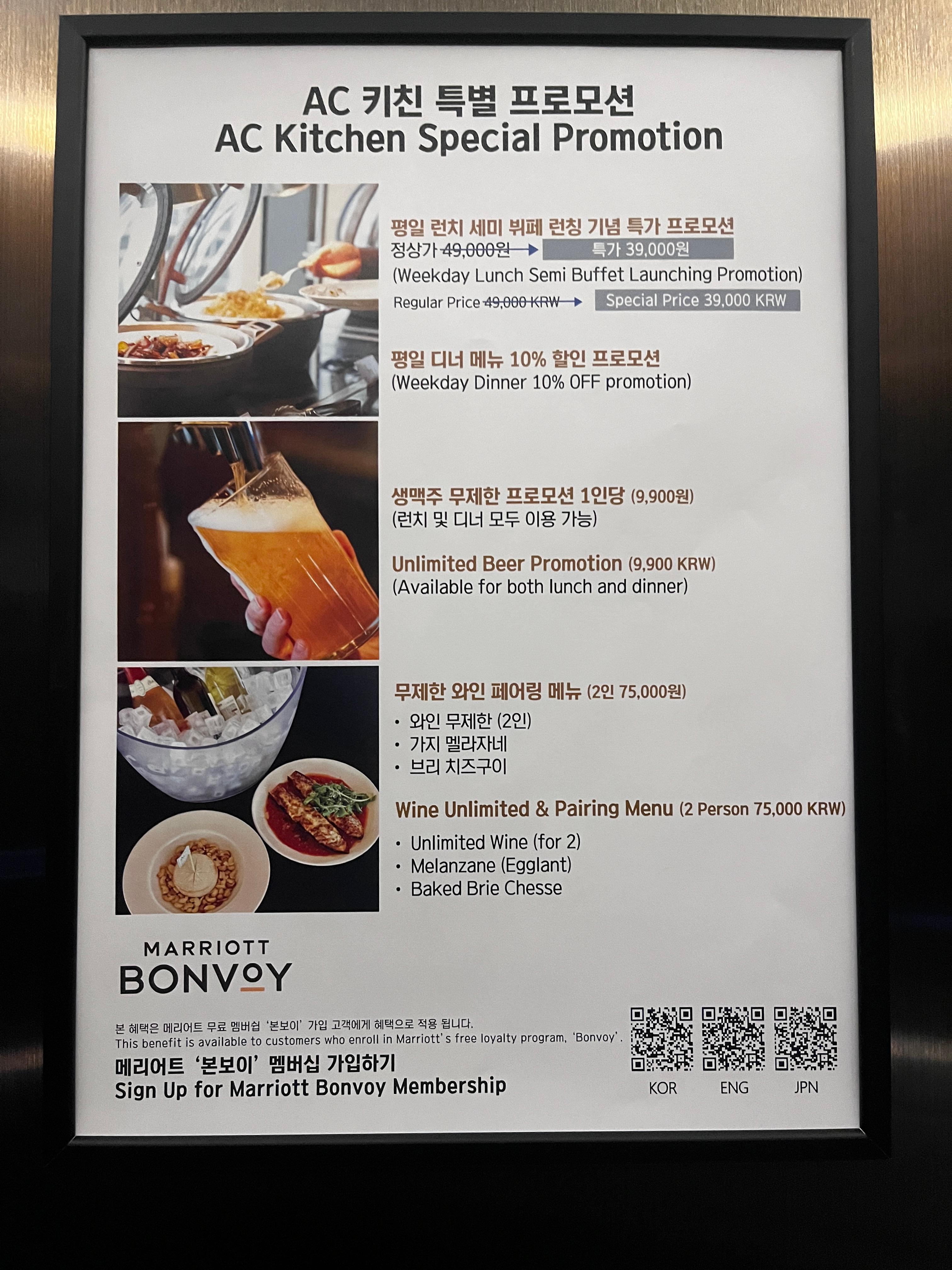 엘리베이터 내에는 평일 런치 런칭 기념 특가로 39,000원 프로모션 진행 홍보를 하고 있었어요.