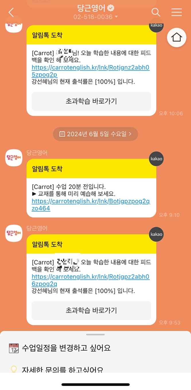 수업 종료 후 바로 카카오톡 알림으로 피드백을 보내줍니다.