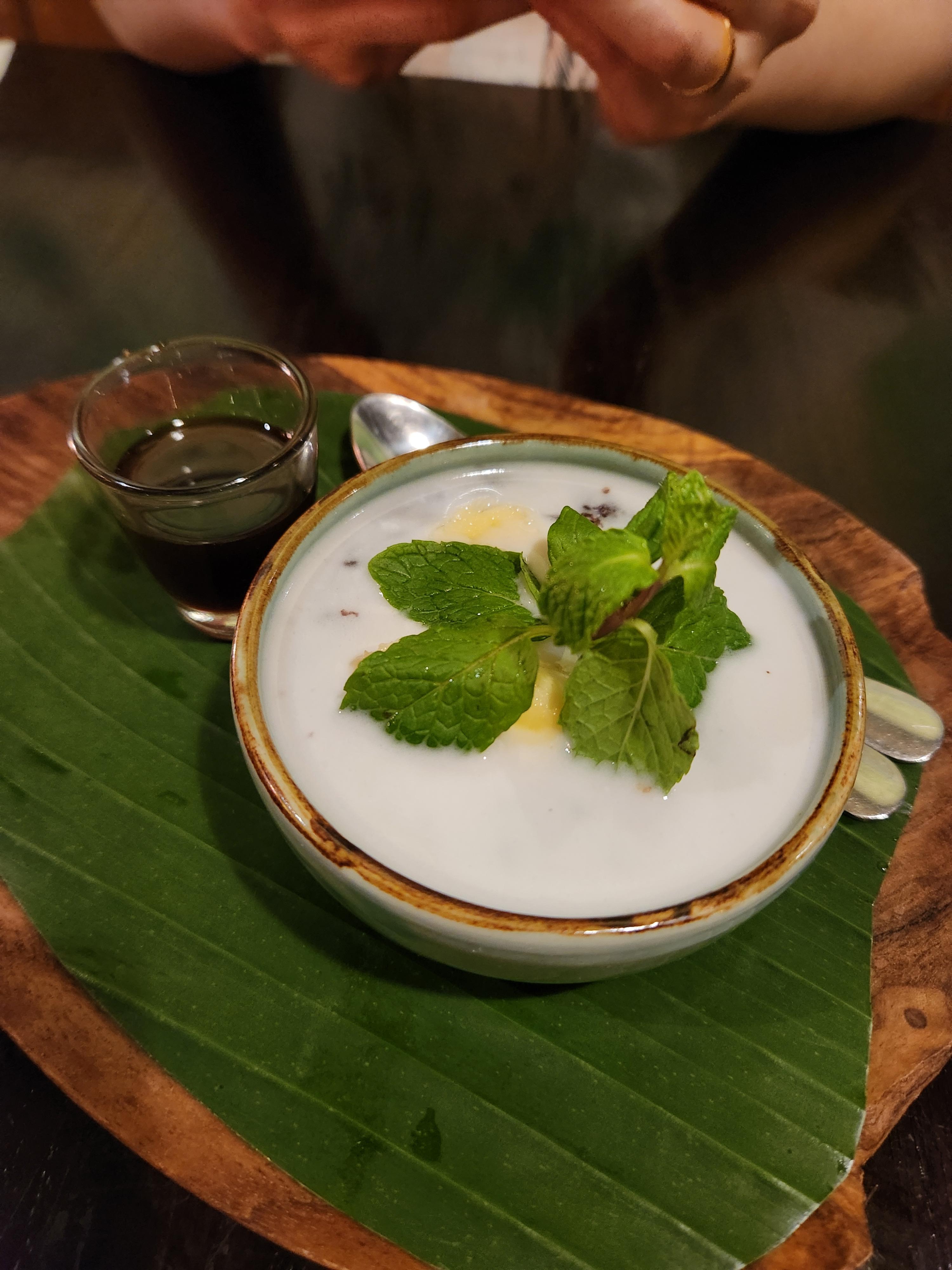 마지막으로 먹은 메뉴는 현지 디저트로 주로 후식으로 먹는 음식인데, 검은 쌀로 만든 따뜻한 팥빙수 같은 맛이 나는 디저트였습니다. 검은 쌀과 찹쌀을 섞어 끓이다가 야자 설탕으로 단 맛을 낸 후에 코코넛 밀크를 흥건하게 부어 만든다고 하는데 그래서인지 달달한 맛이납니다. 향신료를 잘 못 먹는 남편도 부부르인진은 잘 먹더라구요.