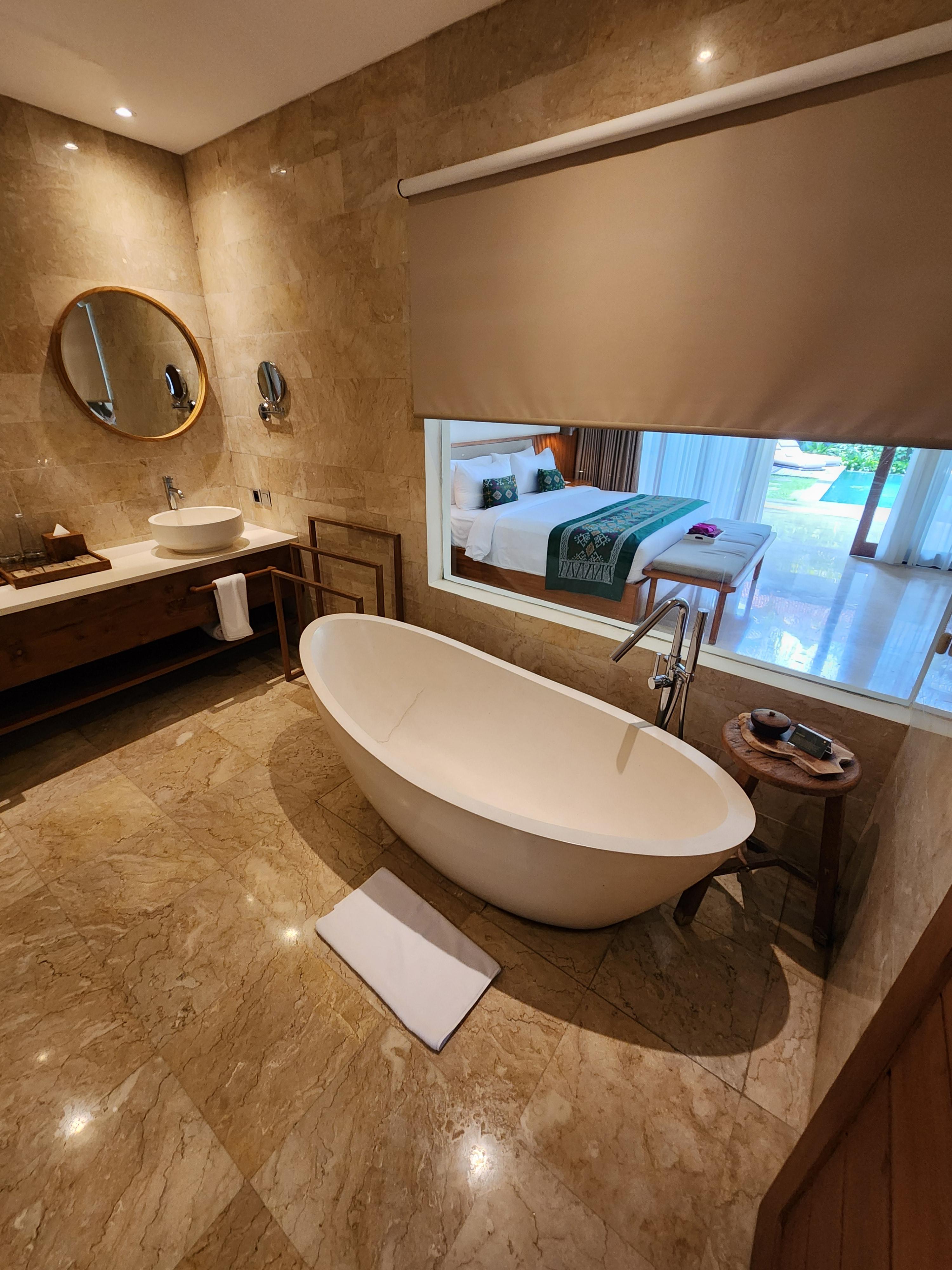 화장실은 정말 컸습니다. 세면대, 욕조와 샤워장, 화장실이 있었고 화장실에 욕조에서 밖에 풀빌라가 통창으로 보입니다.