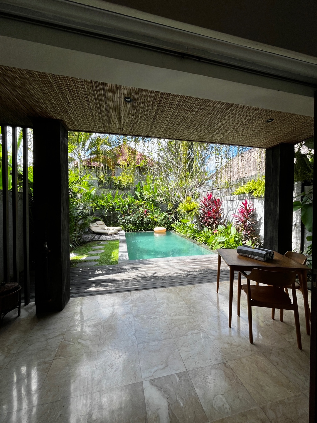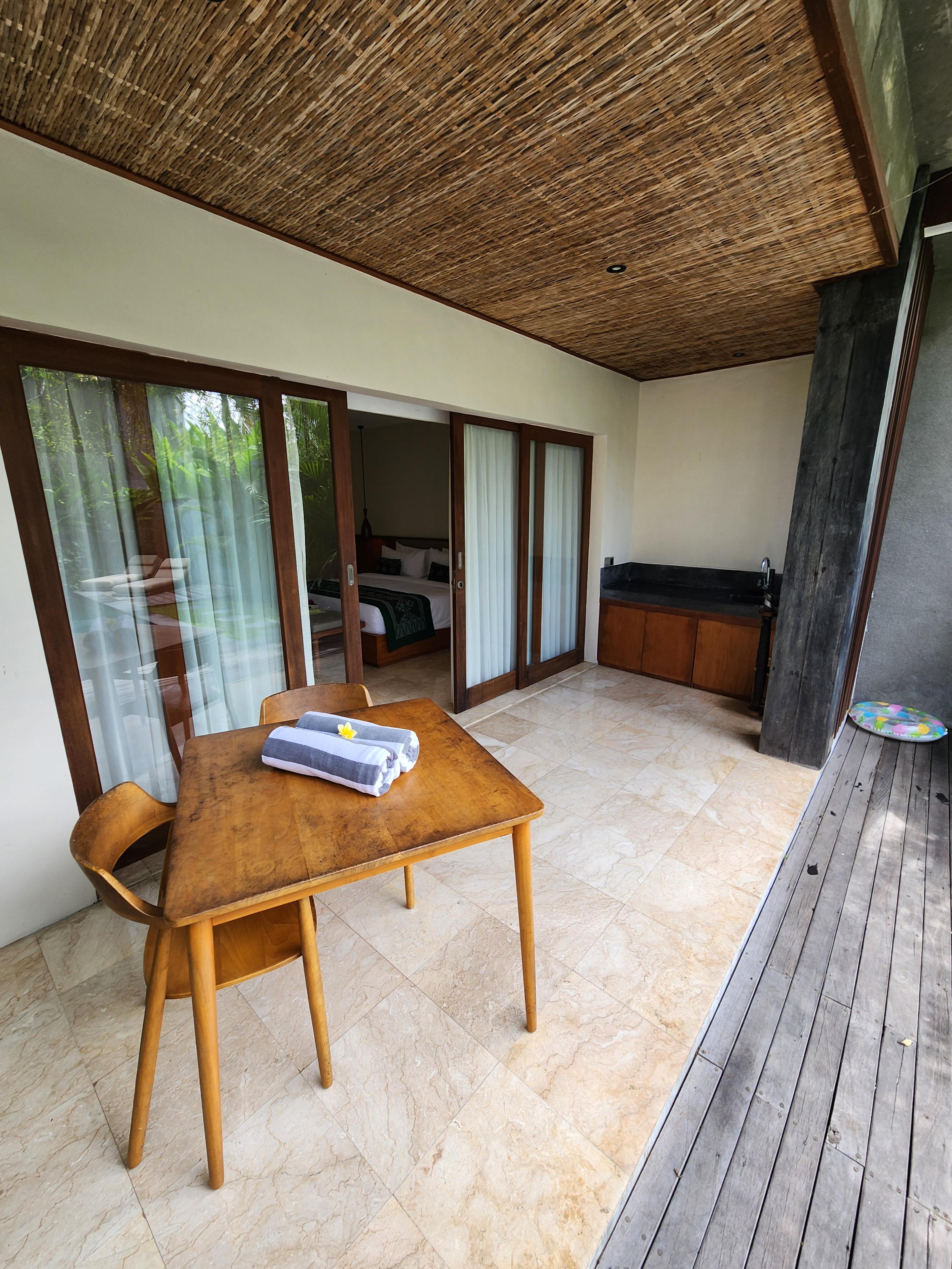 숙소와 풀빌라는 여닫이 문으로 구분합니다. 밖에 식탁이 있어 이 곳에서 애프터눈 티를 즐겼습니다.