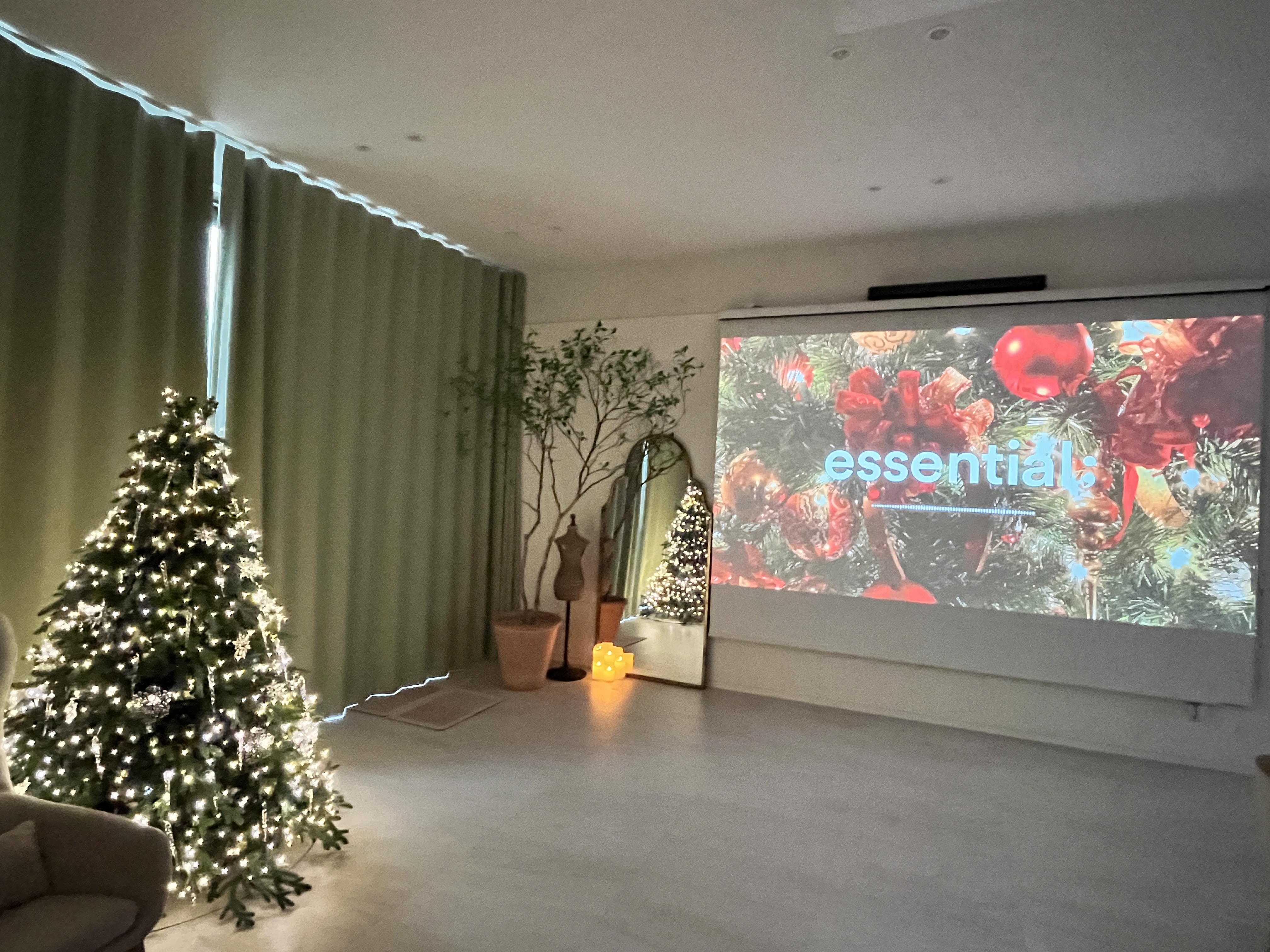 거실에는 스크린이 있었고 빔과 연결해서 사용이 가능했습니다. 숙소에 트리기 있길래 유튜브로 에센셜 크리스마스 음악을 틀어 미리 크리스마스 분위기도 내보았습니다. 사운드바가 있어 음향도 정말 좋았어요.