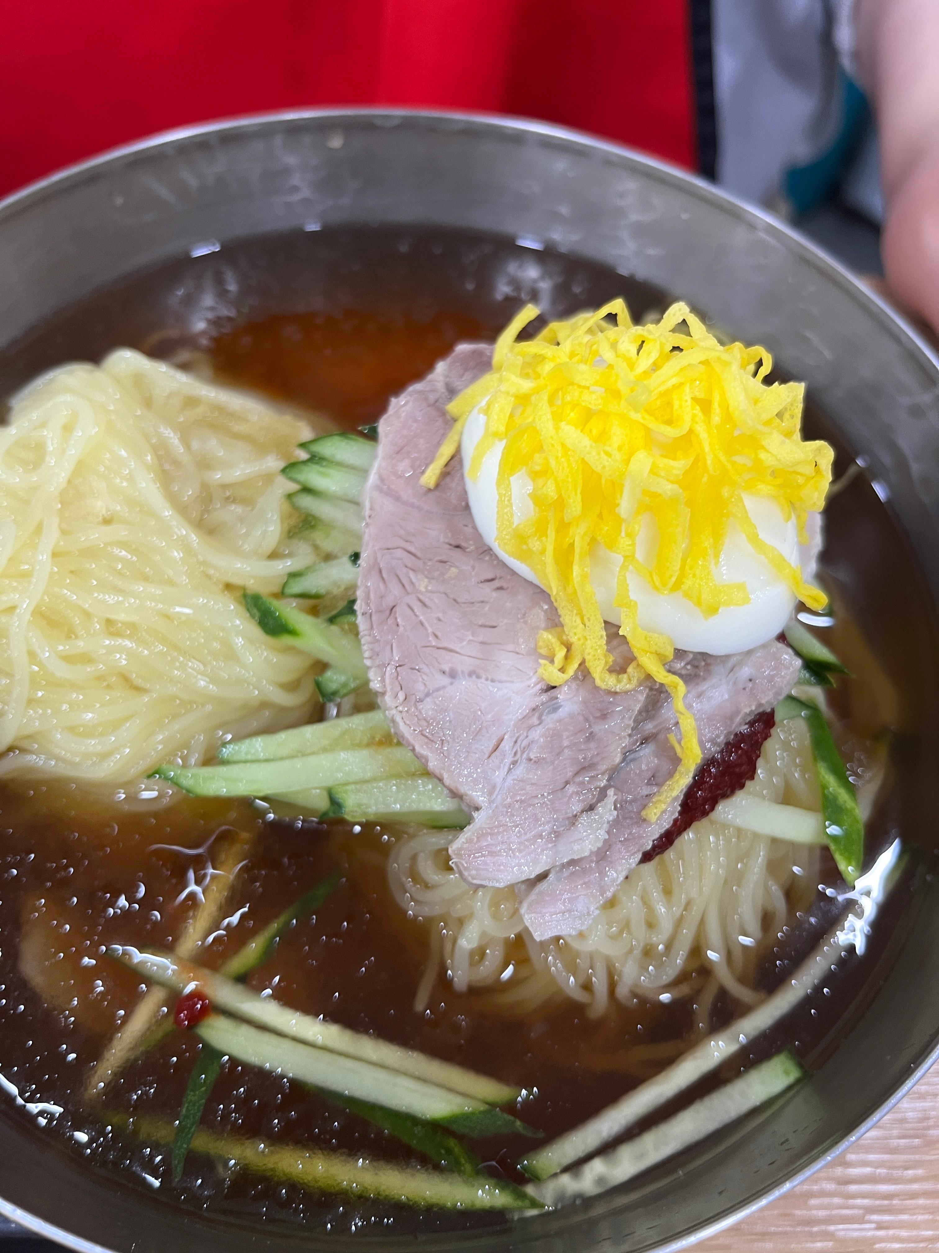 시원한 육수에 쫄깃한 면발, 오이, 계란, 고기가 어우러진 부산 전통 밀면. 여름철 시원하게 즐기기 좋습니다.