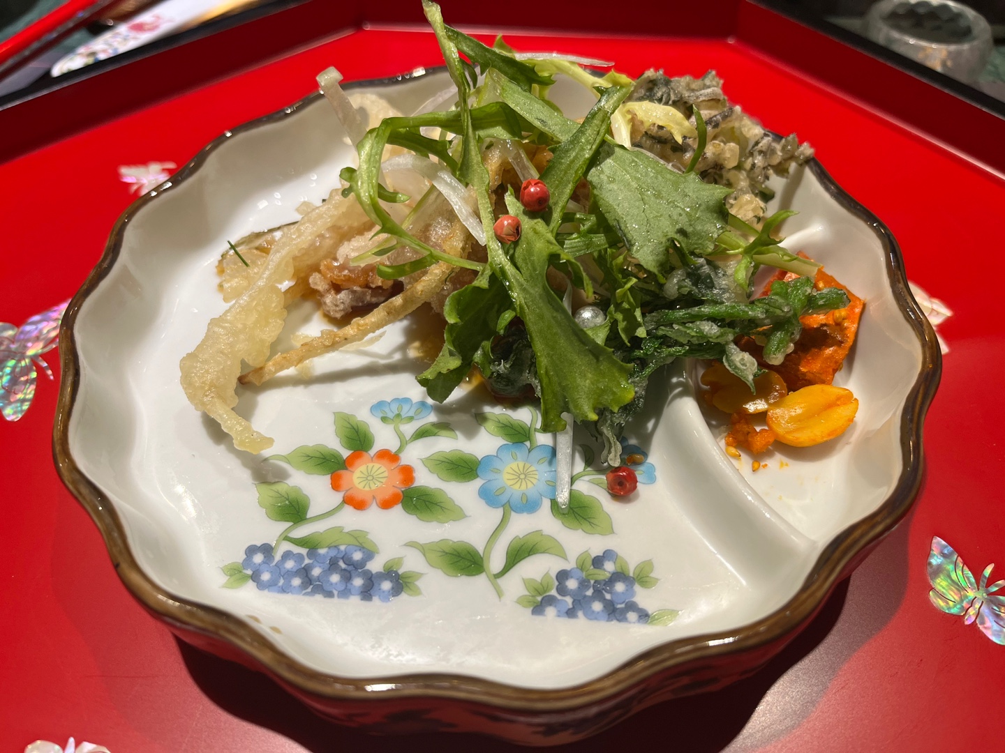 다섯번째 요리는 봄 나물을 튀긴 유림계였습니다. 화려한 자개트레이에 봄을 가득 담은 봄나물