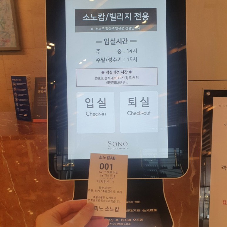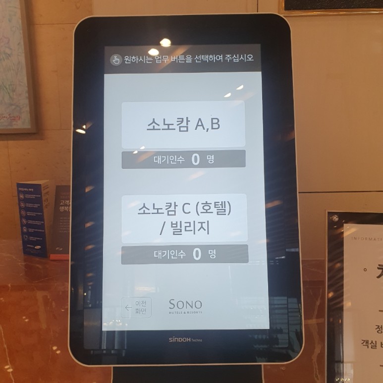 소노캄 건물로 들어간 후 프런트 옆에 번호표에서 번호표를 뽑아야합니다.