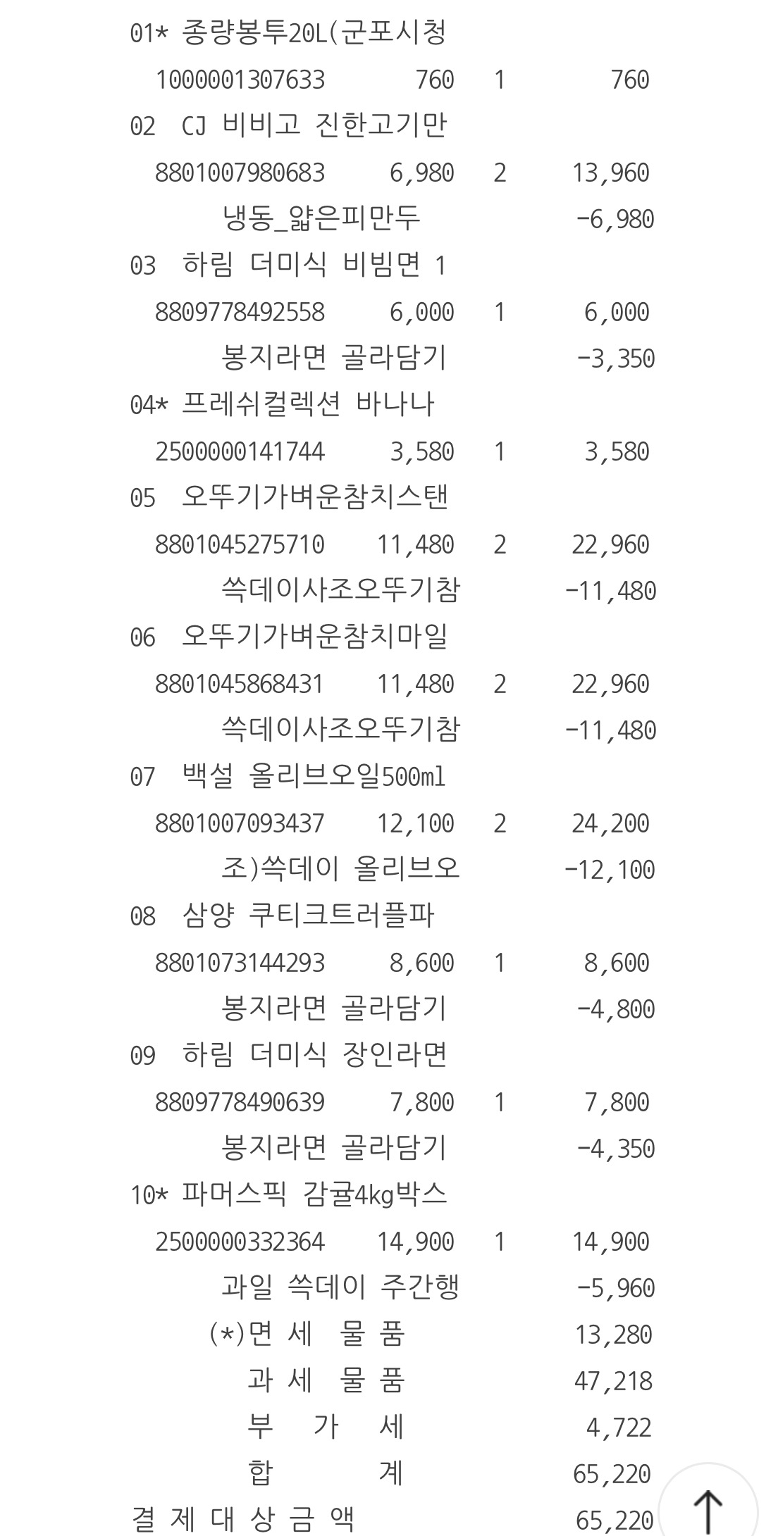 그리고 올리브 오일 그다음에 참치 그리고 귤을 구매를 했는데요.