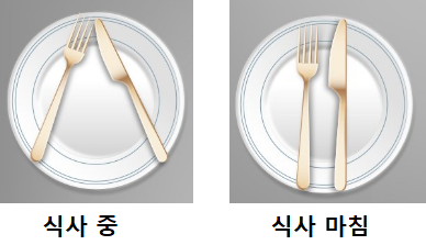 그리고 식사 중일 때 나이프와 포크를 위의 사진과 같이 놓으면 식사 중 / 식사 마침을 표할 수 있습니다.