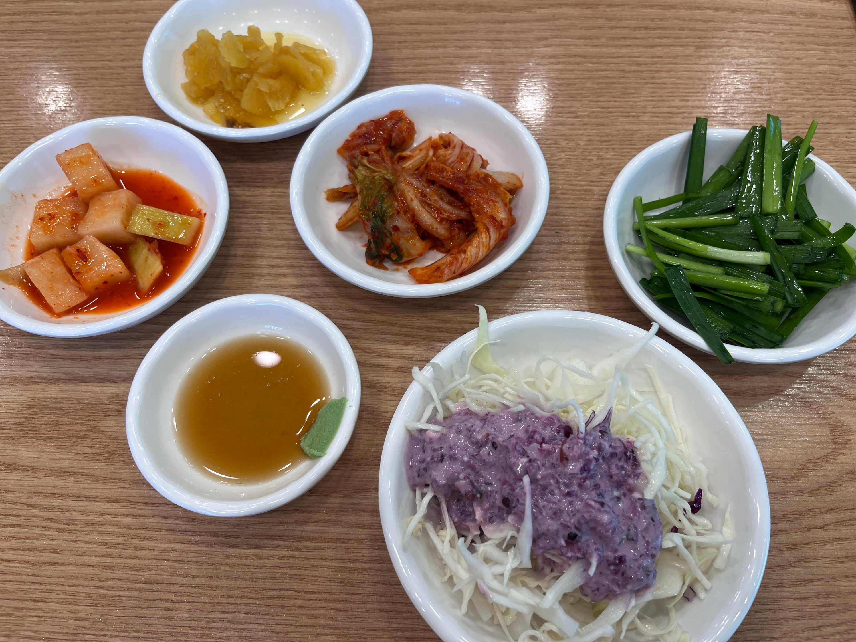 주문하자마자 반찬들이 나왔어요. 저는 양배추 샐러드를 좋아하는데 블루베리 소스와 같이 주셨는데 별미였습니다.