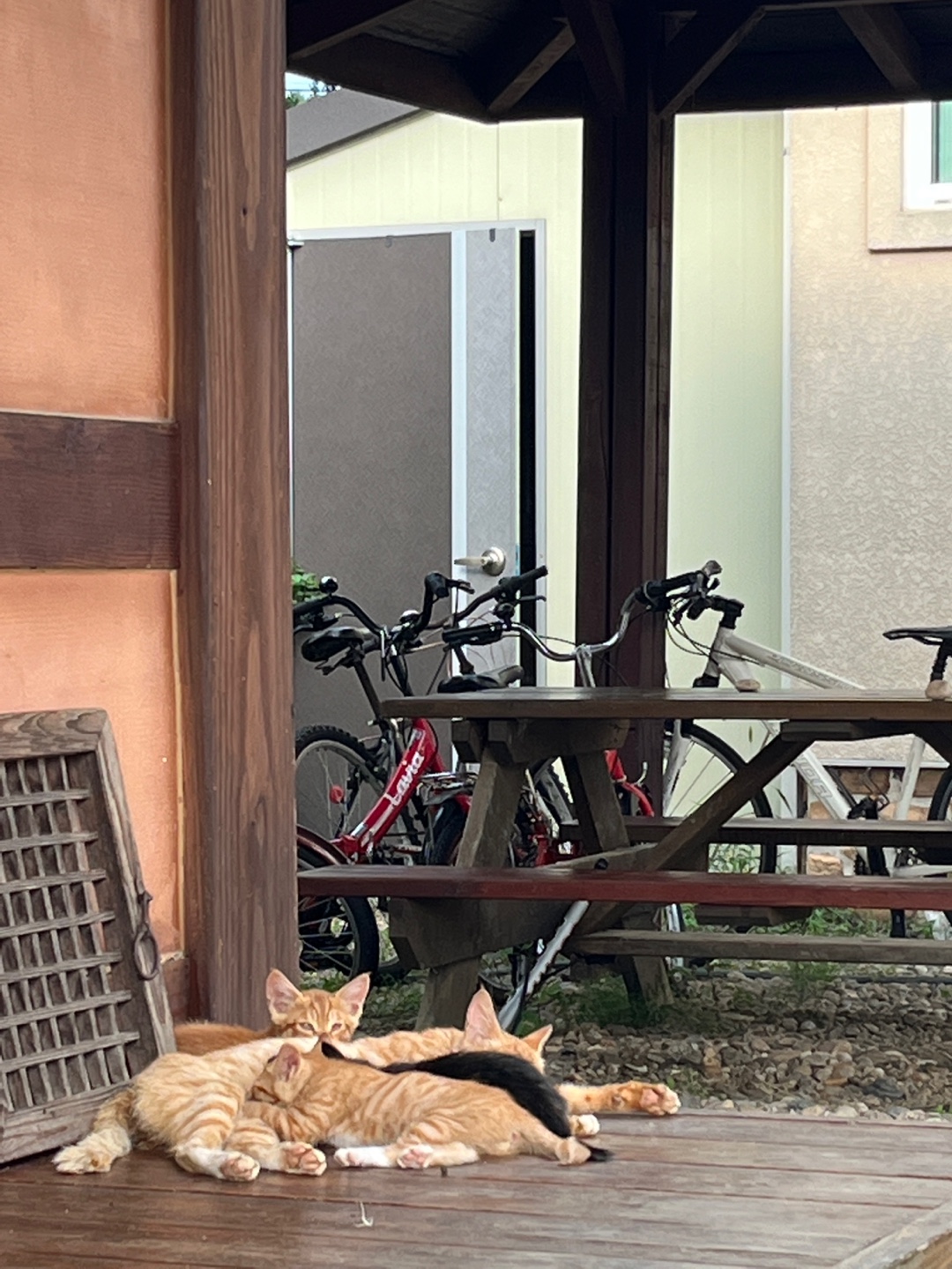 엄마 고양이가 새끼 고양이들을 데리고 다녀요. 제가 고양이를 무서워해서 만지지는 못했는데 아기 고양이들이 굉장히 귀여웠습니다.