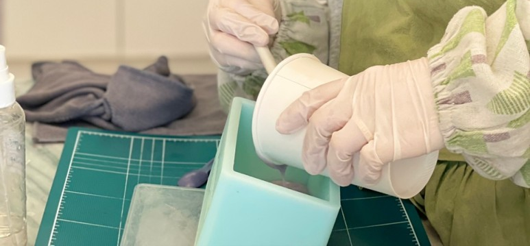 비누틀에 용액을 부어가며 디자인합니다.