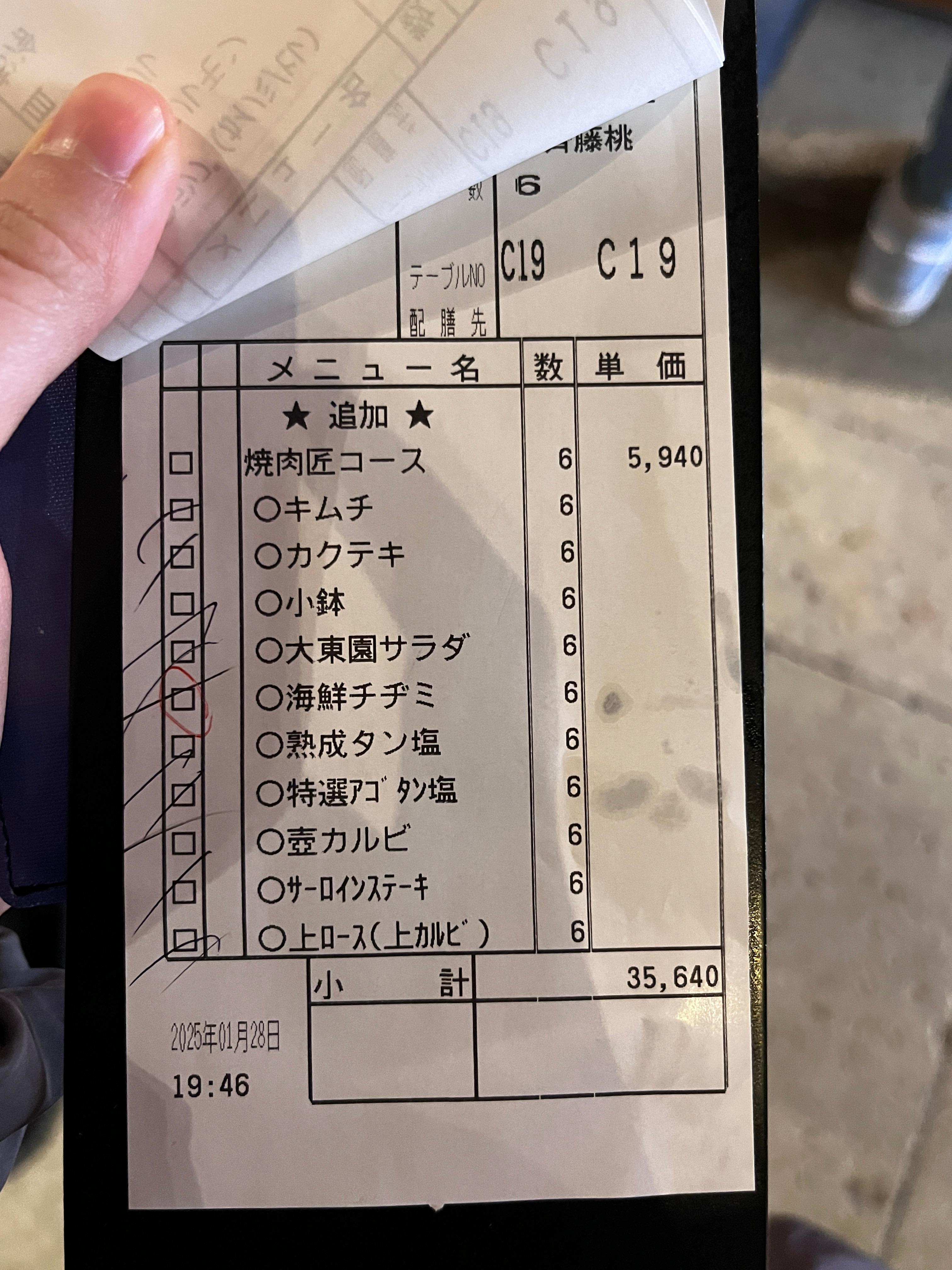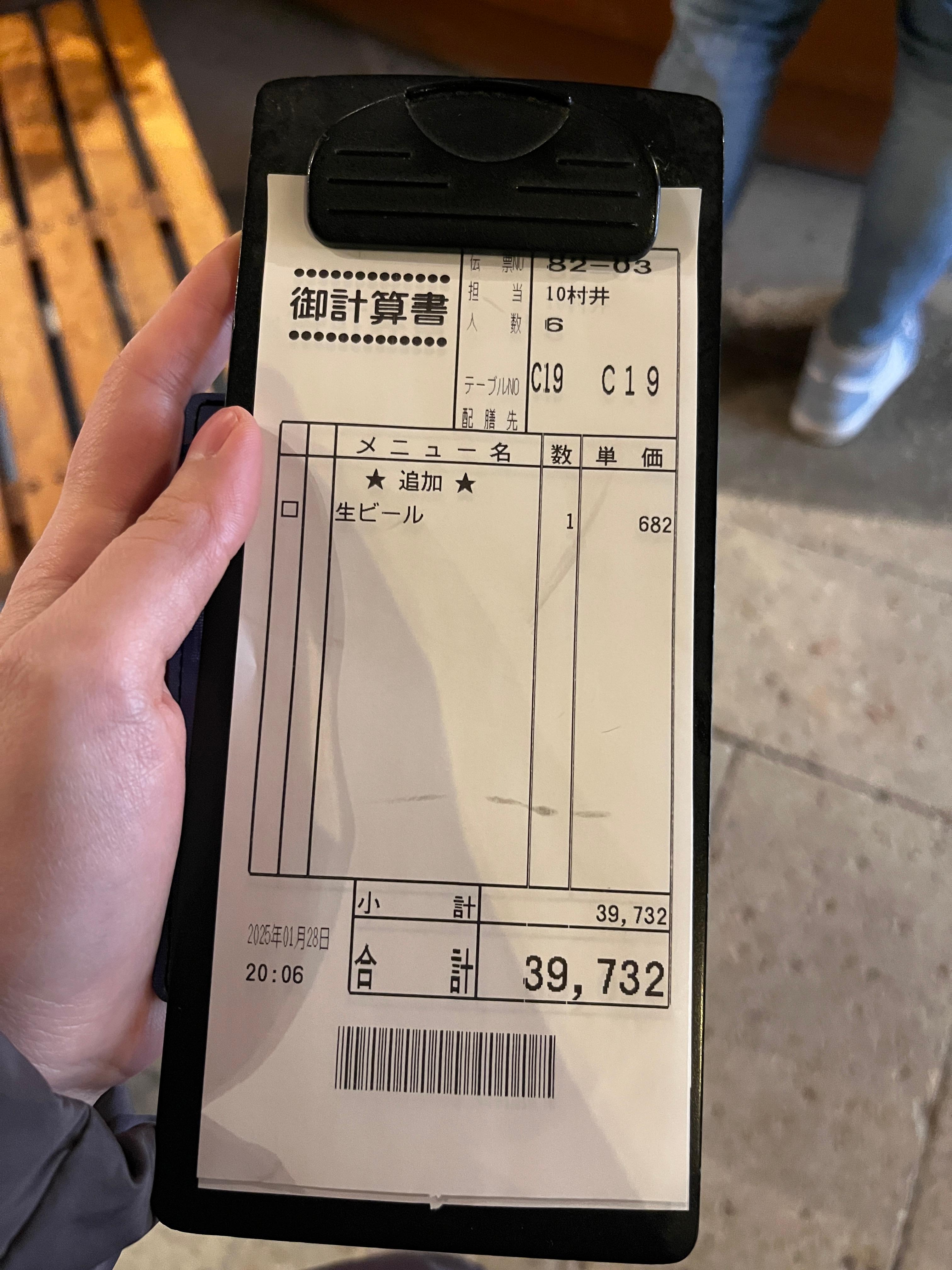 저희는 6인이었고 야키니쿠 장인정식 5,940엔 6개와 생맥주를 주문해서 총 39,732엔이 나왔습니다.