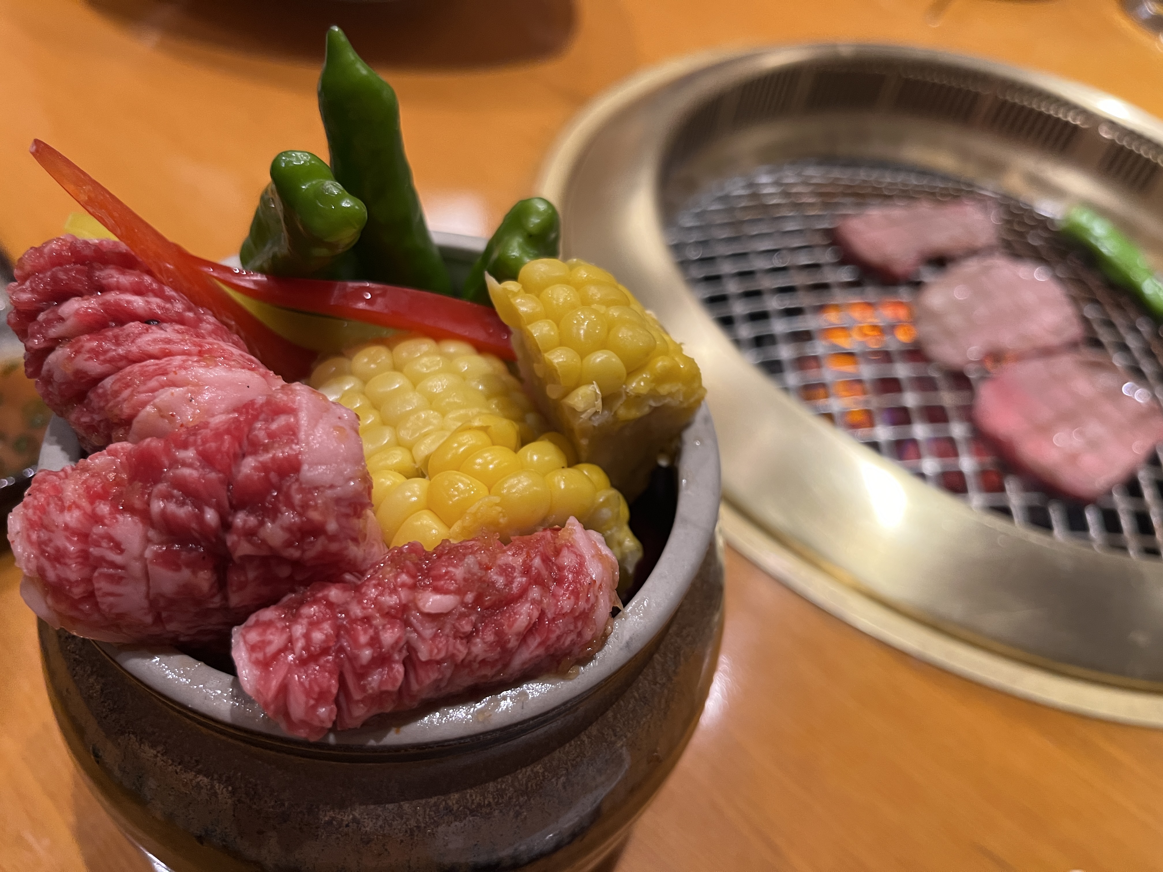 다음 나온 메뉴는 화분처럼 생긴 그릇에 예쁘게 담아나왔습니다. 옥수수, 파프리카, 통마늘, 꽈리고추가 들어있었고 고기와 함께 구워먹었습니다.