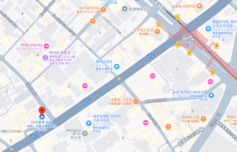기온역에 위치하고 있고 하카타역에서 충분히 걸어서 갈 수 있는 위치에 있습니다.