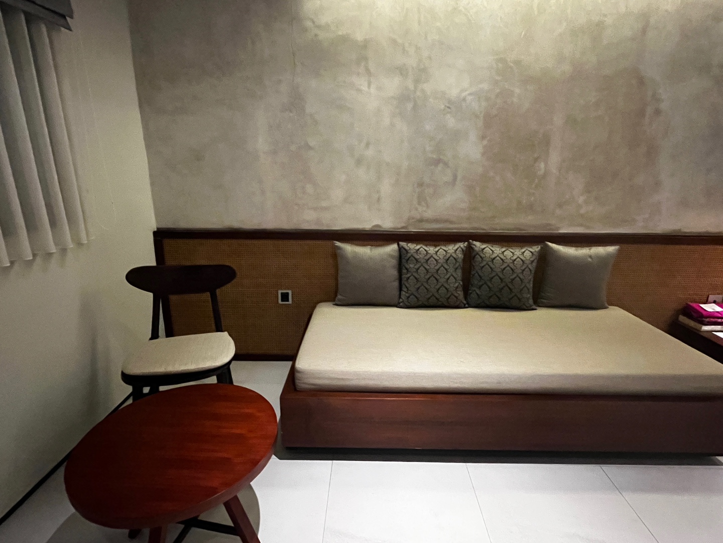 소파 오른쪽, 침대 왼편에는 협탁이 있는데 협탁에는 사롱 3장과 테이블, 그리고 웰컴스낵이 있었습니다.