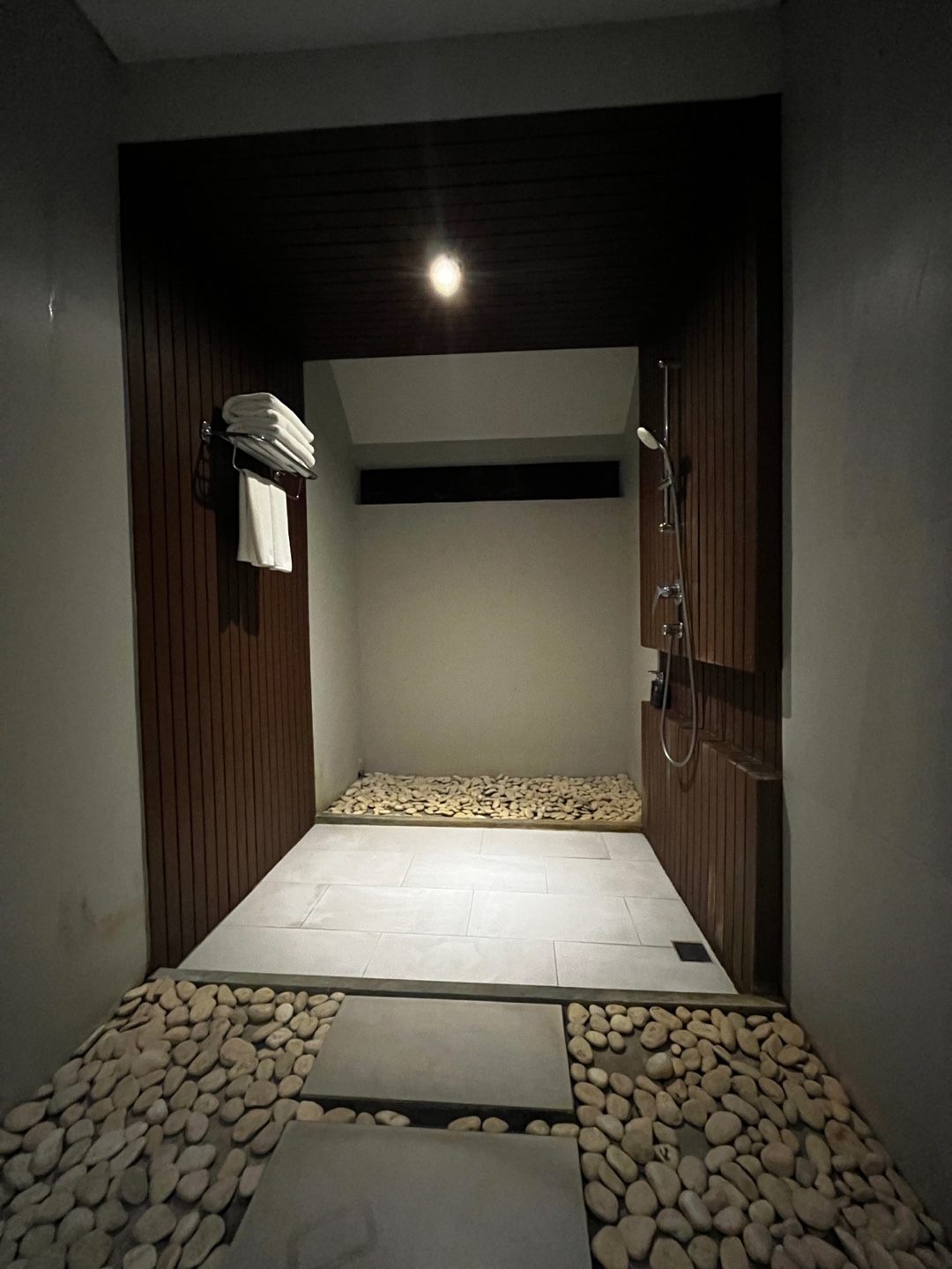 화장실에 욕조는 따로 없었고 화장실 샤워부스 쪽 상단이 뚫려있어 야외에서 샤워하는 기분이 들었습니다.
